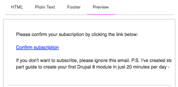 By default in Drip, the link in confirmation emails is a standard link with no styling at all. Styling this as a button will make it stand out and make it obvious that the new subscriber should click on it if they want to confirm their subscription. This could increase the proportion of people who confirm.