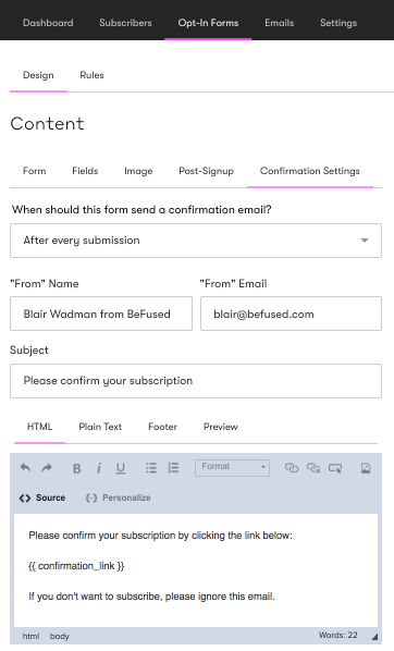 Confirmation emails are sent to new subscribers when they are added to a campaign. To see the confirmation email, head to the Opt-In Forms tab in your campaign and then Confirmation Settings.