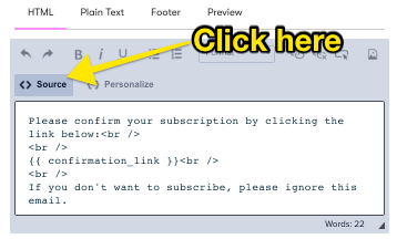 Go back to the HTML tab in the confirmation email and click on the source button.
