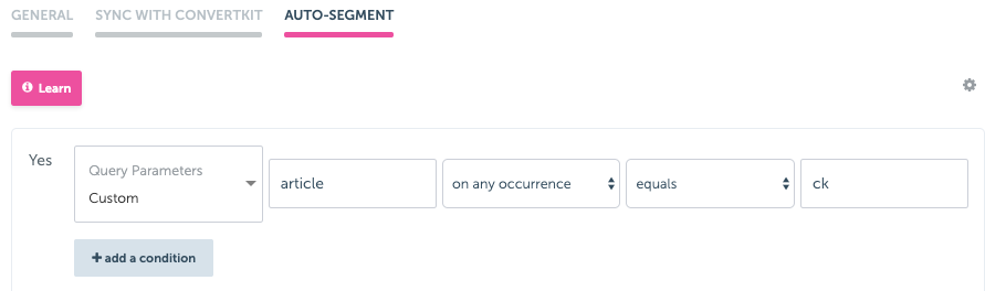 This means that it will auto-segment to yes when someone clicks on a link with ?article=ck added to the URL for a landing page (or any page). So if I’m linking to my newsletter landing page, I can automatically segment people with the following URL and query parameter: