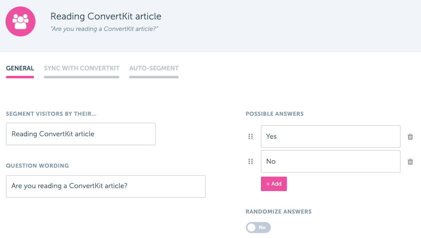 And then head over to the segmentation group in RightMessage. In the “Sync with ConvertKit” field, select the custom field that you created in ConvertKit. The value in the field can simply be yes and no for the respective fields.