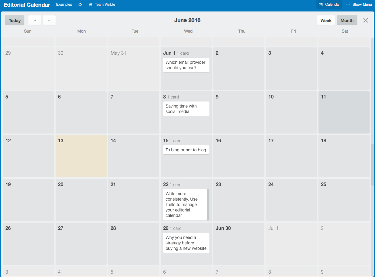With each card, I set a due date, which is the date it will be published. You can add a calendar to your board by going to Power ups. You will then see a nice calendar with the publication dates of all of your blog posts, making it really clear to see when they are going live. You can drag them around in the calendar if you wish, which will automatically change the due date. Quite often I set the dates on each card and then re-arrange them in the calendar view because it is easier to see them all at once.